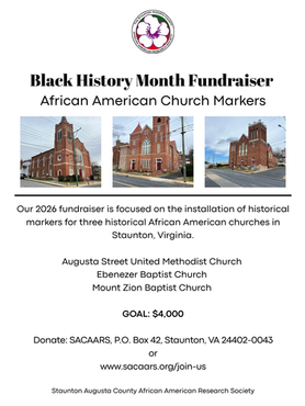 Black History Month Fundraiser in February, 2026: raising funds to install historical markers for three black churches founded between 1885-1889. Our goal is $4,000.